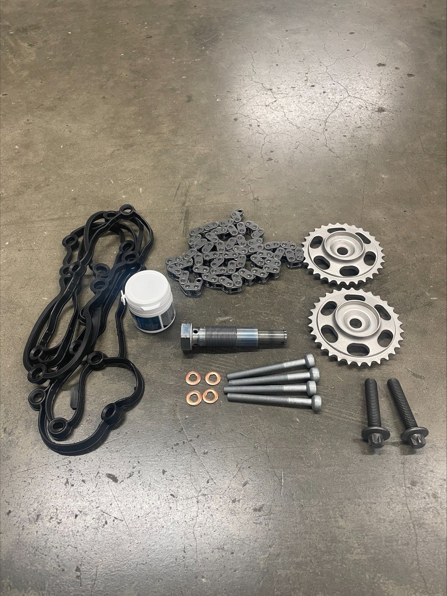 Timing chain, chain tensioner, x2 camshaft gears, x2 bolts for camshaft gears, x4 injector bolts & washer, rocker cover gasket & 1 tub of injector grease.